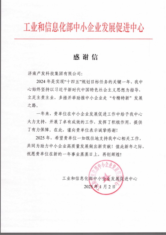 近日,济南产发科技集团有限公司(以下简称“科技集团”)收到一封来自工业和信息化部中小企业发展促进中心(以下简称“促进中心”)的感谢信,信中对科技集团在2024年中小企业发展促进工作中发挥积极作用、提供有力保障表示由衷感谢。