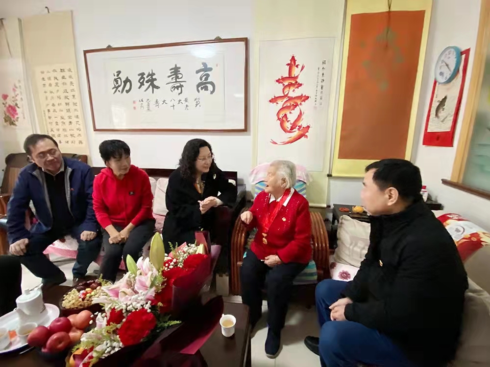 随后黄蓓一行来到元首集团离休老干部、老党员黄显和家中,送上鲜花和慰问金,致以佳节祝福,与黄显和老人座谈交流。93岁的黄显和老人年轻时在湖南读书期间就接受革命洗礼,秘密加入学校进步社团,在“白色恐怖”下开展爱国运动,转业后在济南针织厂辛勤耕耘近十八载,1982年4月离休,是名副其实的巾帼模范代表。黄蓓代表集团党委感谢她为党和企业做出的突出贡献,对其在革命年代的英勇事迹表示崇高敬意,表示伟德国际victor1946要传承好老一辈不惧艰辛、敢于奋斗、无私奉献的精神,凝心聚力、接续奋斗。