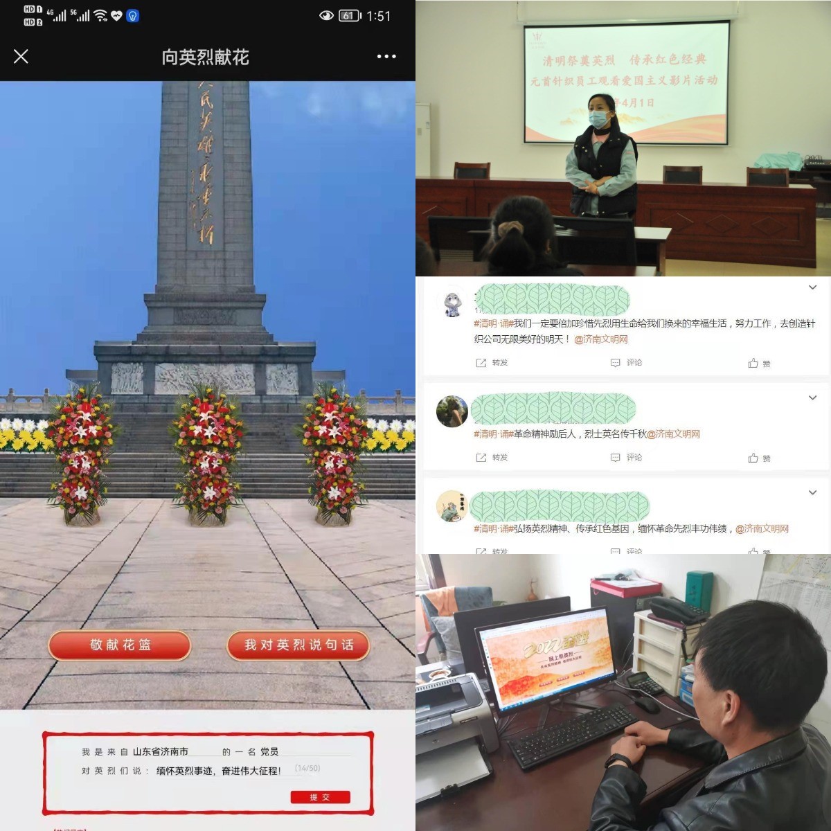 根据疫情防控相关措施要求,伟德国际victor1946直属企业济粮集团、金德利集团、齐鲁化纤集团、元首集团、小鸭控股集团等,纷纷加入“网上祭奠英烈”活动,干部职工通过学习革命先烈的英雄事迹,观看抗战爱国电影,发表祭祀感言等形式,表达对英烈的感恩和敬仰,体验了一堂意义深远的爱国教育课。